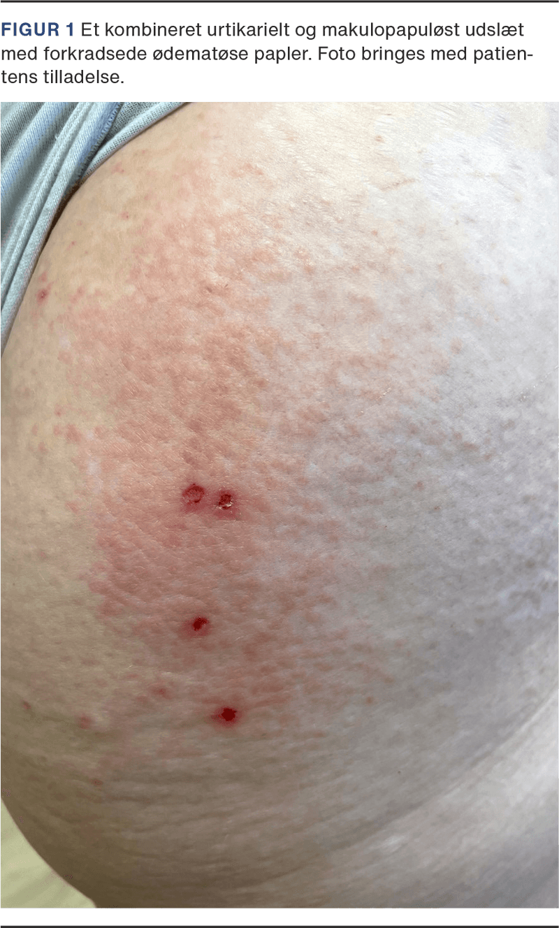 En 44-årig kvinde blev henvist til praktiserende hudlæge på mistanke om scabies. Hun var tidligere hudrask fraset vitiligo. Hun var ikke diagnosticeret med kontaktallergi eller type I-allergi. Hun havde igennem flere måneder oplevet et stærkt kløende, rødflammet ikkeflygtigt udslæt omkring hofter, balder og lår, og det spredte sig senere på kroppen og involverede brystregionen. Udslættet var dagligt symptomgivende med præmenstruel forværring. Objektivt fandtes et kombineret urtikarielt og makulopapuløst udslæt med forkradsede ødematøse papler (Figur 1). En medicingennemgang viste, at hun havde fået oplagt en hormonspiral kort før symptomdebut. Efter seponering af denne hormonspiral var der umiddelbar bedring. De følgende måneder fik hun atter behov for behandling med antihistamin og potent lokalsteroid grundet tydelig symptomforværring omkring ægløsning og et par dage før menstruation. Patienten blev derfor henvist til hudafdeling grundet mistanke om APD. En hudstansebiopsi viste forandringer, som morfologisk var bedst forenelig med en urtikariel reaktion. En provokationstest med tabl. progesteron 100 mg, 1 tabl. dagligt i ti dage, var inkonklusiv. Provokationstesten foregik umiddelbart under/efter menstruationen, hvor progesteronniveauet forventedes at være lavt. Baseret på kasuistiske beskrivelser i litteraturen blev der herefter initieret off-label anti-IgE-behandling i form af inj. omalizumab 300 mg subkutant hver 3.-4. uge, hvilket medførte markant bedring af tilstanden [4].