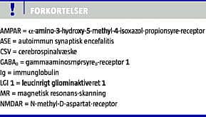 AMPAR er ligesom NMDAR involveret i neuronal plasticitet og dermed hukommelse og indlæring [5]. Normal funktion er med til at forhindre epilepsi. Selvom AMPAR findes udbredt i CNS, synes autoimmuniteten primært at være rettet imod strukturer i hippocampus [5]. Som det fremgår af Tabel 1, minder de kliniske symptomer meget om anti-NMDAR-encefalitis [5, 14], men i modsætning til denne ses der ofte også nystagmus og konfabulationer.
