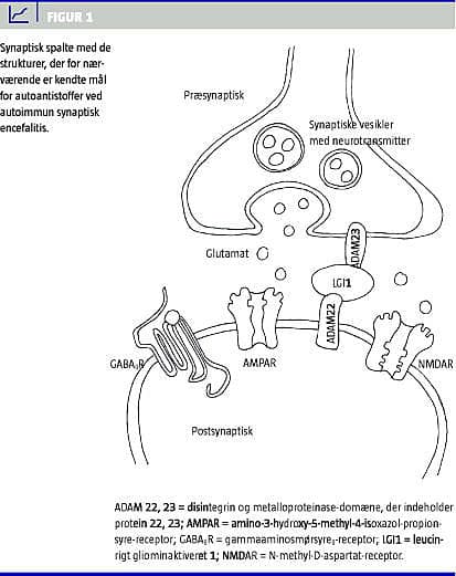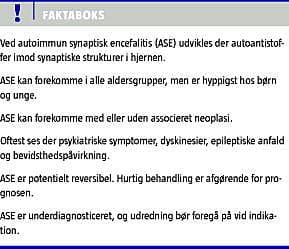 Knap halvdelen af alle encefalitistilfælde er uden kendt årsag [2]. En stor del af disse forekommer hos børn og unge, men de kan ses i alle aldersgrupper. Det er nu påvist, at der i sådanne tilfælde kan forekomme autoantistoffer imod nervecellernes synaptiske strukturer [3-6]. Denne nye sygdomsgruppe betegnes autoimmun synaptisk encefalitis (ASE) og udgør i øjeblikket ca. 10% af alle encefalitistilfælde [2].
