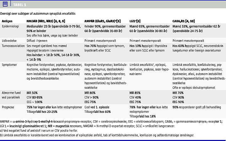 Anti-NMDAR-encefalitis er den hyppigste form for ASE og ses ofte hos børn og unge. Sygdommen er væsentligt hyppigere hos kvinder end hos mænd (Tabel 1 ), og blandt kvinder over 18 år provokeres tilstanden hos ca. halvdelen af et ovarielt teratom. Hos børn er en sådan association sjældnere, men forekommer alligevel hos op til 9% af piger under 14 år. Ved denne nye form for encefalitis er antistofferne rettet imod NR1-subunit i NMDAR, hvorimod der er tale om antistoffer imod NR2-subunit ved f.eks. systemisk lupus erythematosus med cerebral involvering.