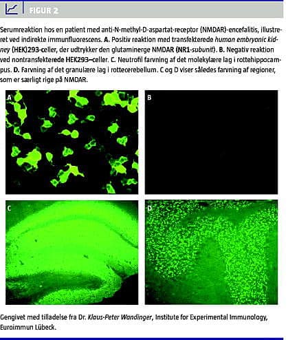 Infektiøs encefalitis skal initialt udelukkes. Der bør udføres magnetisk resonans (MR)-skanning af cerebrum, lumbalpunktur samt undersøgelse af cerebrospinalvæske (CSV) og eventuelt også serum for autoantistoffer (dette gøres ved indirekte immunofluorescens, se Figur 2 ). Dette gælder både for de klassisk paraneoplastiske markører og de nye ASE-markører. Begge analyser kan bestilles hos Statens Serum Institut som en samlet paraneoplastisk hhv. autoimmun synaptisk encefalitis-pakke. Det anbefales at bestille sådanne pakker frem for separate analyser, også selvom de kliniske symptomer mest tyder på en bestemt undertype af ASE, idet symptomatologien er overlappende, og et ukorrekt førstevalg kan forsinke diagnosen.