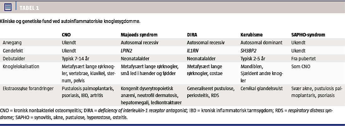 Kronisk nonbakteriel osteomyelitis (CNO) er en ikkeinfektiøs inflammatorisk knoglesygdom, der har ukendt ætiologi og primært rammer børn og unge voksne. Sygdommen hører til de autoinflammatoriske sygdomme og karakteriseres ved mono- og multifokale knoglelæsioner, som medfører smerte og lokal hævelse og har et uforudsigeligt forløb med periodevis forværring og ofte spontan bedring. I forhold til nomenklatur er der endnu ikke konsensus. Anvendte betegnelser for sygdommen er, ud over CNO, kronisk, rekurrent, multifokal osteomyelitis (CRMO), ikkebakteriel ostitis og akut/kronisk ikkebakteriel ostitis. Såfremt der er tale om multifokale læsioner, har betegnelsen CRMO fortrinsvis været anvendt, men i erkendelsen af at tilfælde med kun en enkelt fokal læsion ikke kan skelnes fra de multifokale tilfælde, bruges betegnelsen CNO mere og mere [1, 2]. Den gennemsnitlige debutalder er 9-11 år, og piger rammes oftere end drenge [1-3]. Diagnostiske kriterier er ikke valideret, men er bl.a. foreslået i retrospektive studier [1, 2]. Diagnosen baseres på en kombination af kliniske, radiologiske og histopatologiske fund. Der findes ingen diagnostisk test for CNO, og sygdommen skal udelukkes fra andre differentialdiagnoser som bakteriel osteomyelitis, knogletumorer, lymfomer og Langerhanscellehistiocytose. CNO dækker ud over betegnelsen CRMO også andre autoinflammatoriske knoglesygdomme som synovitis, akne, pustulose, hyperostose, osteitis (SAPHO)-syndrom, Majeeds syndrom, deficiency of interleukin-1 receptor antagonist (DIRA) og kerubisme, som vil blive omtalt her.