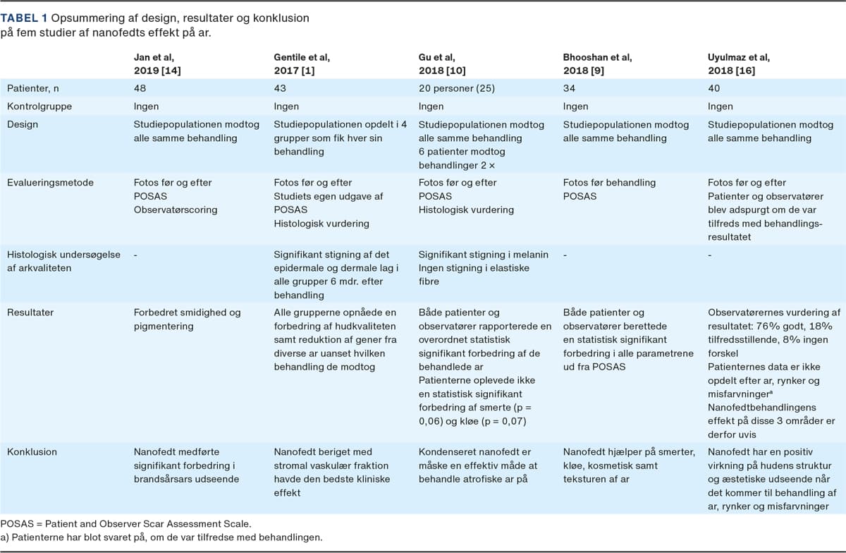 Et prospektivt studie af Bhooshan et al [9] undersøgte, om nanofedt havde en æstetisk effekt på traumatiske ar (n = 27), brandsårsar (n = 5) og inflammatoriske ar (n = 2). I alt 26 ud af 34 opnåede et »godt resultat«, og syv patienter havde ar, som var ældre end fem år. Kun en patient opnåede en æstetisk effekt. Forsøget viste en statistisk signifikant sammenhæng mellem nyere ar og et godt kosmetisk resultat. To ud af seks ar, som var ældre end fem år, blev behandlet igen og opnåede et tilfredsstillende resultat.