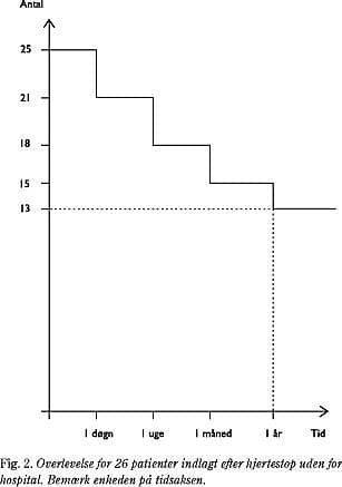 Der blev ydet avanceret CPR til 72 patienter. Af disse blev 25 (35%), 20 mænd og fem kvinder, genoplivet og indlagt på hospital (Fig. 1). Fem patienter døde inden for det første døgn, og yderligere tre patienter døde inden for den første uge. I alt blev 15 (21%) patienter udskrevet fra hospitalet. Tretten patienter var i live efter et år, (Fig. 2), dette svarer til 52% af de patienter, som blev indbragt til hospitalet og 18% af dem, som blev forsøgt genoplivet.