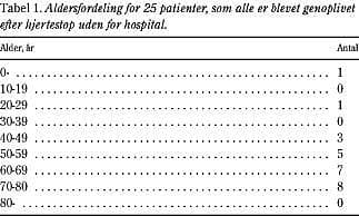 Resultater: Der blev ydet avanceret cardio-pulmonary resuscitation (CPR) til 72 patienter. Af disse blev 25 (35%), 20 mænd og fem kvinder, genoplivet og indlagt på hospital. De resterende 86 patienter blev erklæret døde, uden at der blev ydet behandling. Femten (21%) patienter blev udskrevet fra hospitalet. Tretten (18%) patienter var i live efter et år, heraf 12 patienter uden neurologiske sequelae. Dette svarer til 52% af de patienter, som blev indbragt til hospitalet, og 18% af dem, som blev forsøgt genoplivet.