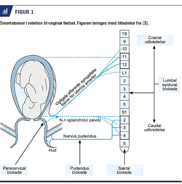Smertelindring af den fødende omfatter information, psykologisk støtte, afspænding, varme bade, lettere farmakologisk smertelindring (lattergas), nerveblokader (epidural-, pudendus- og sakralblokade [3] (Figur 1) eller intravenøst givet opioid, f.eks. remifentanil.
