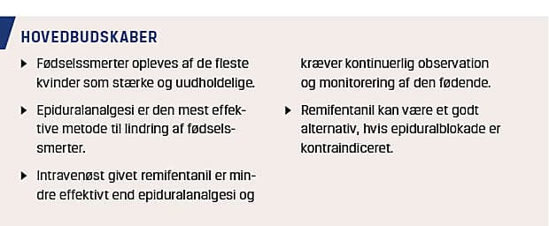 Remifentanil er et syntetisk opioid med egenskaber, der gør det velegnet som fødselsanalgesi [4]. I modsætning til alle andre opioider er halveringstiden meget kort (2-3 min). Den analgetiske effekt af remifentanil som fødselsanalgesi er dokumenteret i en lang række randomiserede studier [5]. Sammenfattende kan det konkluderes, at remifentanil er mindre effektivt end epiduralblokade [6].