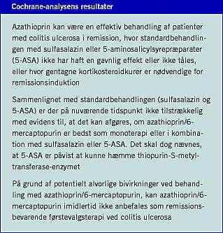 Cochrane-analyse er den bedste evidens, vi har til dato for AZA/6-MP-vedligeholdelsesbehandling til UC-patienter, der af forskellige grunde ikke tåler eller har manglende effekt af sulfasalazin/5-ASA, eller som har behov for gentagne steroidbehandlinger. Det synes at være velindiceret at forsøge AZA - eller hvis patienterne får dyspepsi heraf så 6-MP som remis-sionsbevarende langtidsbehandling til denne UC-population. Anbefalinger vedrørende dosis af AZA og 6-MP samt komedicinering med sulfasalazin eller 5-ASA kan ikke angives ud fra Cochrane-analysens resultater, ligesom der heller ikke kan opstilles retningslinjer for behandlingslængden. Selv om der ikke foreligger undersøgelser af behandlingslængden ved IBD, bør den ud fra litteraturen være 4-5 år, hvorefter den bør tages op til revision, idet en længere behandlingsperiode menes at øge risikoen for lymfomudvikling [4].
