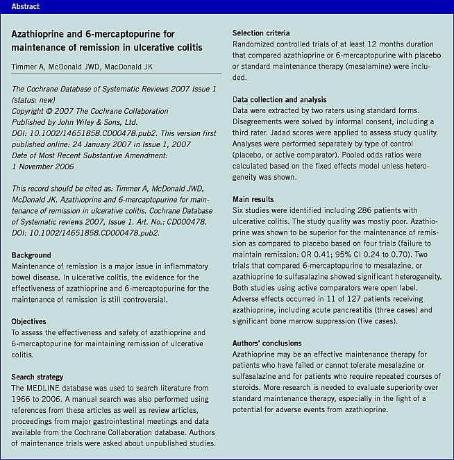 - Timmer A, McDonald JWD, MacDonald JK. Azathioprine and 6-mercaptopurine for maintenance of remission in ulcerative colitis. Cochrane Database of Syst Rev 2007;24:CD000478.