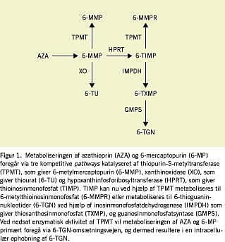 Thioguaninderivatet AZA er et pro-drug, som metaboliseres i leveren og resulterer i 6-MP, som efterfølgende bliver metaboliseret i leveren og tarmen af et af tre forskellige enzymer 1) thiopurin-S-metyltransferase (TPMT), som giver 6-metylmercaptopurin (6-MMP), 2) xanthin-oxidase (XO), som giver 6-thiourat (6-TU) og 3) hypoxanthin-fosforibosyltransferase (HPRT), som via andre enzymer giver 6-thioguaninnukleotider (6-TGN), der menes at besidde den immunsupprimerende effekt (Figur 1). Den kliniske effekt af AZA og 6-MP er således antageligvis den samme, om end der ikke eksisterer komparative studier med mennesker. Metabolitterne fra den enzymatiske nedbrydning af AZA og 6-MP akkumuleres langsomt i vævet. Dette er formentlig forklaringen på den forsinkede effekt (3-4 måneder) og årsagen til, at AZA og 6-MP ikke har plads i førstelinjebehandlingen af den akut syge UC-patient [4]. Dertil kommer, at den intracellulære ophobning af metabolitter, specielt 6-TGN, menes at være årsagen til præparaternes potentielt toksiske virkning. AZA og 6-MP er begge purinanaloger, hvorved de bl.a. giver en kompetitativ antagonistisk effekt ved syntesen af DNA og RNA og dermed en immunsuppressiv effekt og celleproliferationshæmmende virkning [5]. På denne baggrund kan såvel AZA som 6-MP foranledige livstruende knoglemarvsdepression specielt blandt patienter med TPMT-mangel (ca. 0,3% af befolkningen er homozygote herfor; ca. 11% er heterozygote (dvs. har nedsat enzymaktivitet)), hvilket resulterer i en øget produktion af 6-TGN. Ydermere menes risikoen for alvorlige infektioner eller udvikling af neoplasier at være øget [4]. Øvrige bivirkninger i forbindelse med behandlingen er konditioneret af allergiske reaktioner med deraf betinget pankreatitis, hepatitis, feber og eksantem.
