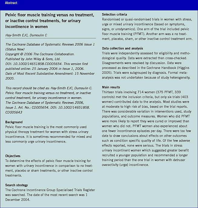 - Hay-Smith EJ, Dumoulin C. Pelvic floor muscle training versus no treatment, or inactive control treatments, for urinary incontinence in women. Cochrane Database Syst Rev 2006;CD005654.
