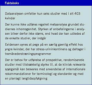 Cochrane-analysens største svaghed er, at data fra de forskellige studier vanskeligt kan sammenlignes pga. inhomogenitet i design, herunder i valg af træningsprogrammer, patientmaterialer, definitioner af inkontinens, måling af effekt mv. Et andet stort problem er den generelt ringe metodologiske kvalitet i de medtagne studier. Design, populationsstørrelser og datarapporteringer lader meget tilbage at ønske. Det er nedslående, at man kun i et studie har beskrevet den anvendte randomiseringsmetode tilfredsstillende, og øvrige studier angives som havende moderat til høj risiko for bias. Det er bemærkelsesværdigt, at langt den største behandlingseffekt (RR 20,0 for helbredelse eller væsentlig forbedring) sås i et studie med utilstrækkelig sløring af allokering [6], hvilket derfor kan være en overestimering.