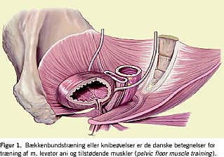 Bækkenbundstræning eller knibeøvelser er de danske betegnelser for træning af m. levator ani og tilstødende muskler ( pelvic floor muscle training (PFMT)) (Figur 1 ). PFMT som behandling af ufrivillig vandladning (urininkontinens (UI)) hos kvinder blev populariseret af gynækologen Arnold Kegel i efterkrigstidens USA, men er beskrevet tidligere i litteraturen af andre. Ved PFMT tilstræbes en forbedring af flere muskulære kontinensmekanismer: en hurtigere muskelkontraktion før eller under fysisk anstrengelse, en øget muskelstyrke og en facilitering af reflekskontraktion af bækkenbunden ved brug af mavemusklerne. Rationalet bag anvendelsen af PFMT i behandling af UI tilskrives dels levatorernes støtte og afklemning af urinrøret bag symfysen, dels en styrkelse af urinrørets lukkemuskel (sphincter uretrae). Nyere forskning har dog vist, at levator ani og sphincter urethrae er separate muskler med unik nerveforsyning, idet sfinkter får motoriske fibre via nervus pudendus og levator ani innerveres af grene direkte fra plexus sakralis [1].