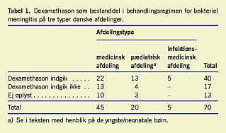 Bakteriel meningitis (BM) forekommer i Danmark med incidensen 3,8 pr. 100.000 pr. år svarende til ca. 200 tilfælde årligt [1]. Trods adgang til effektiv antibiotisk behandling har sygdommen fortsat en mortalitet på gennemsnitligt 20% (3-75% afhængig af ætiologi), og mellem en tredjedel og to tredjedele af de overlevende får sequelae [2, 3]. Resultater fra litteraturen har indtil for få år siden været modstridende vedrørende effekten af dexamethasonbehandling som tillæg til antibiotikabehandling ved BM hos børn og voksne. En dobbeltblindet, randomiseret, kontrolleret multicenterundersøgelse med 301 voksne patienter fra 2002 ændrede dette, og man påviste, at dårligt udkomme forekom hos færre patienter ved tidlig behandling med dexamethason (15% vs. 25%; 95% konfidensinterval (KI) af relativ risiko (RR) = 0,37-0,94) og forekom hos patientgruppen med pneumokokmeningitis hos 26% vs. 52%, (RR = 0,30-0,83). Mortaliteten ved Streptococcus pneumoniae blev ligeledes halveret fra 34% til 14%, (RR = 0,19-0,86) [4]. Tidlig dexamethasonbehandling har siden været tilrådet i udlandet og i Danmark til voksne patienter med BM, hvor man har mistanke om S. pneumoniae [5-8]. Publicerede undersøgelser vedrørende dexamethasonbehandling af børn med BM har inkluderet færre patienter, har ikke været af tilsvarende metodologiske kvalitet og har givet varierende resultater, og der er ikke international konsensus om brugen af dexamethason ved BM hos børn [2, 8-11]. Da relevant empirisk antibiotikabehandling også er afgørende for muligheden af et godt udkomme, blev dette spørgsmål inkluderet i denne undersøgelse af aktuelle lokale retningslinjer for behandling af BM.