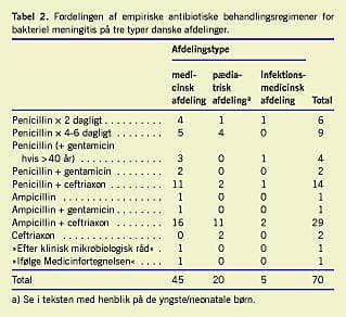 Den tilrådede empiriske antibiotikabehandling varierede markant inden for afdelingstyperne (Tabel 2 ). På de infektionsmedicinske afdelinger tilrådede man fire forskellige regimener, der efter bakteriologisk dækningsgrad kan rubriceres i to behandlingstyper. På de internmedicinske afdelinger tilrådede man ni forskellige præciserede regimener, der for penicillins vedkommende varierede markant i dosishyppighed/døgn (× 2 versus × 4-6). På de pædiatriske afdelinger tilrådede man fem forskellige regimener, der efter ætiologisk dækningsgrad reelt kan rubriceres i tre behandlingstyper. På 18 pædiatriske afdelinger havde man separat instruks for de helt små eller »neonatale« børn, og disse rekommandationer var oplyst for ti af afdelingerne. Således tilrådede man på syv pædiatriske afdelinger ampicillin plus gentamicin, dog med de varierende øvre aldersgrænser fire uger (n = 4), tre måneder (n = 1) eller seks måneder (n = 2). På en af de sidstnævte afdelinger tilrådede man at supplere med ceftriaxon til børn i aldersgruppen 4 uger-3 måneder. På en afdeling tilrådede man behandling med ampicillin plus ceftriaxon, på en tilrådede man supplering af dette med gentamicin, og på en afdeling anbefalede man cefotaxim plus ampicillin til børn yngre end fire uger.