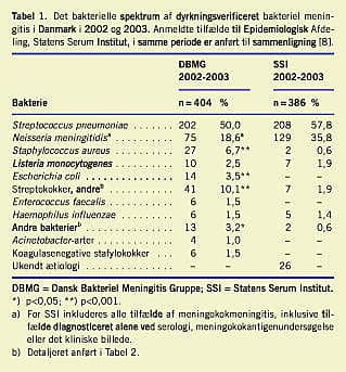 Materiale og metoder: Data vedrørende alle bakterielle fund af klinisk relevans fra cerebrospinalvæske blev indsamlet fra de klinisk mikrobiologiske afdelinger for årene 2002 og 2003. Fordelingen blev sammenlignet med opgørelser af anmeldte tilfælde fra Statens Serum Institut (SSI).