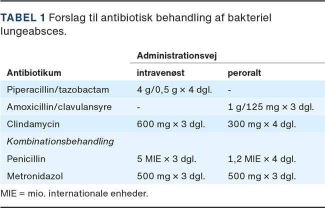 Den gængse behandlingsstrategi er initialt intravenøst (i.v.)-givet behandling med efterfølgende skift til oralt givede præparater. Historiske artikler angiver en mortalitet ved medicinsk behandling med arsenik til 34,7%, mens mortaliteten ved kirurgisk fjernelse var 32,7%. Introduktionen af penicillin revolutionerede behandlingen og mindskede mortaliteten til 16,7% [22]. Mindre, klinisk randomiserede studier fra USA og Spanien viste behandlingssvigt ved brug af penicillin i monoterapi hos henholdsvis 47% og 44% af deltagerne, og pencillinresistente Bacteroides-species blev påvist som årsag til dette [10, 15]. I samme studier blev der påvist hurtigere og bedre behandlingsrespons ved brug af clindamycin. Monoterapi med metronidazol har vist sig at være uegnet til behandling af lungeabsces og har haft en stor grad af behandlingssvigt, formentlig på grund af dets manglende effekt på den grampositive del af floraen [23, 24]. Senere studier har vist, at behandling med moxifloxacin og betalaktamantibiotika kombineret med betalaktamasehæmmere er ligeværdige i behandlingen af lungeabsces [25, 26].
