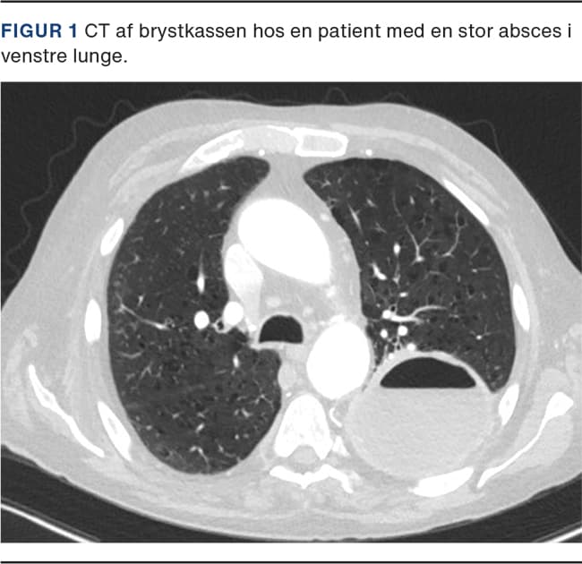Konventionel røntgenoptagelse af thorax vil ofte være den førstvalgte billeddiagnostiske modalitet og kan vise en kavitet med luft-væske-spejl. CT af thorax med kontrast er hjørnestenen i påvisning af lungeabsces (Figur 1). Adskillelse af pleuraempyem med luft-væske-spejl og absces kan være vanskelig, men er afgørende for behandlingen, da empyemer ofte bør drænbehandles.