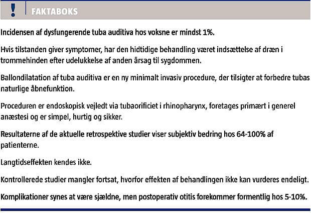 Det eustakiske rør – tuba auditiva (TA) – er anatomisk og funktionelt en del af mellemøret og består af en proksimal ossøs del i umiddelbar forlængelse af mellemøret og en kartilaginøs del, som forbinder mellemøret med rhinopharynx. Længden er hos voksne ca. 35 mm, hvoraf den bruskede del udgør to tredjedele. Mellemøret kan opfattes som et relativt nonkompressibelt luftrum, som er forbundet med de øvrige omgivelser via et naturligt kompressibelt luftrum i TA. Disse egenskaber er unikke i det respiratoriske organ, som mellemøret fylogenetisk er en del af. Ud over at være naturlig barriere fra rhinopharynx for potentielle patogener og en del af det innate immunsystem i mellemøret har TA to yderligere hovedfunktioner: mukociliær transport og trykudligning i mellemøret via muskulær dilatation af den bruskede del. Dysfungerende TA er et hyppigt problem hos børn, men tilstanden kan persistere i voksenalderen. Incidensen anslås hos voksne at være 1-5% [1, 2]. De patogenetiske faktorer inkluderer kronisk infektion, allergi, laryngeal refluks, primær mucosasygdom, anatomisk obstruktion og dysfungerende dilatationsmekanisme [3, 4]. Dysfungerende TA kan føre til forskellige symptomer og sygdomme f.eks. serøs otitis og kronisk otitis media (COM), begges sequelae er velkendte og inkluderer atrofi af trommehinden, retraktioner, perforation og kolesteatom. Hvis der ikke findes nogen oplagt ætiologi, eller hvis medicinsk behandling er refraktær, er standardbehandlingen indsættelse af dræn i trommehinden. Patienter med kronisk dysfungerende TA kan have brug for gentagne drænbehandlinger eller behandling med langtidsdræn (tympanomeatalt dræn). Imidlertid kan begge behandlinger give anledning til infektioner, skorpedannelse, ekstrudering, forkalkninger af trommehinden, blivende trommehindeperforation og tilstopning af drænet [5]. Indlæggelse af stent og plastik på den faryngeale del af TA er forsøgt uden overbevisende resultater [6, 7].