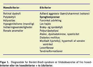 De oprindelig foreslåede diagnostiske kriterier blev udarbejdet af Schachat & Maumenee og er for nylig blevet revideret af Beales [20, 21]. I litteraturen er der derudover beskrevet et bredt spektrum af andre relaterede anomalier, som er til stede i meget varierende grad hos BBS-patienterne, her kaldet bikriterier [1, 2, 21-24]. Fire hovedkriterier eller tre hovedkriterier plus to bikriterier er diagnostiske for syndromet (Figur 1 ).