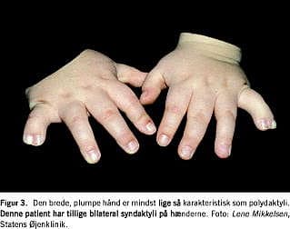 Den hyppigste form for ekstremitetsdysmorfologi er den postaksiale polydaktyli, som findes hos to tredjedele af patienterne varierende fra en enkelt rudimentær finger/tå til en ekstra finger/tå på hver ekstremitet [1, 2, 21, 22, 24]. Syndaktyli og brakydaktyli er også hyppigt forekommende hos patienterne (Figur 3 ).