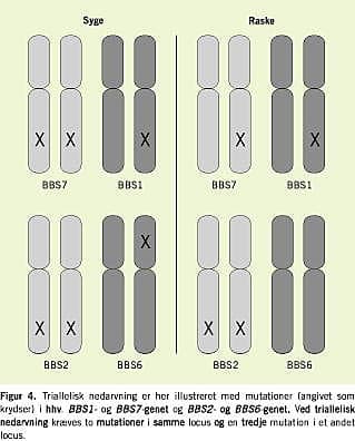 Indtil for nogle få år siden antog man, at BBS udelukkende nedarvedes autosomalt recessivt [1, 2], men flere grupper har nu vist, at der også er tilfælde, hvor der kræves tre mutationer i to loci: en mutation i begge alleler i et locus og en tredje mutation i et enkelt allel i et andet locus [3-6]. Denne tredje mutation kan være afgørende for både tilstedeværelse af sygdom og sværhedsgraden af sygdommen. Katsanis et al kaldte dette triallelisk nedarvning [5], mens Burghes et al foreslog termen recessive inheritance with a modifier of penetrance [7].