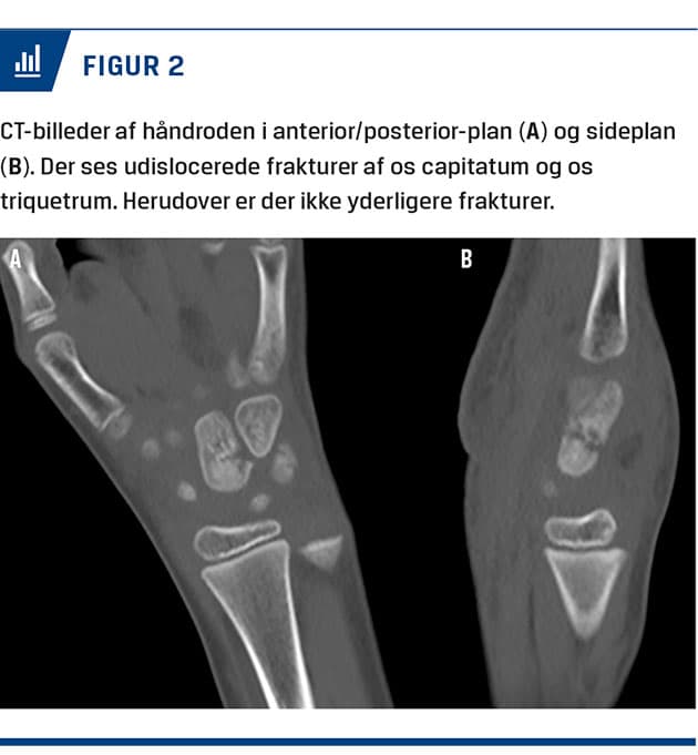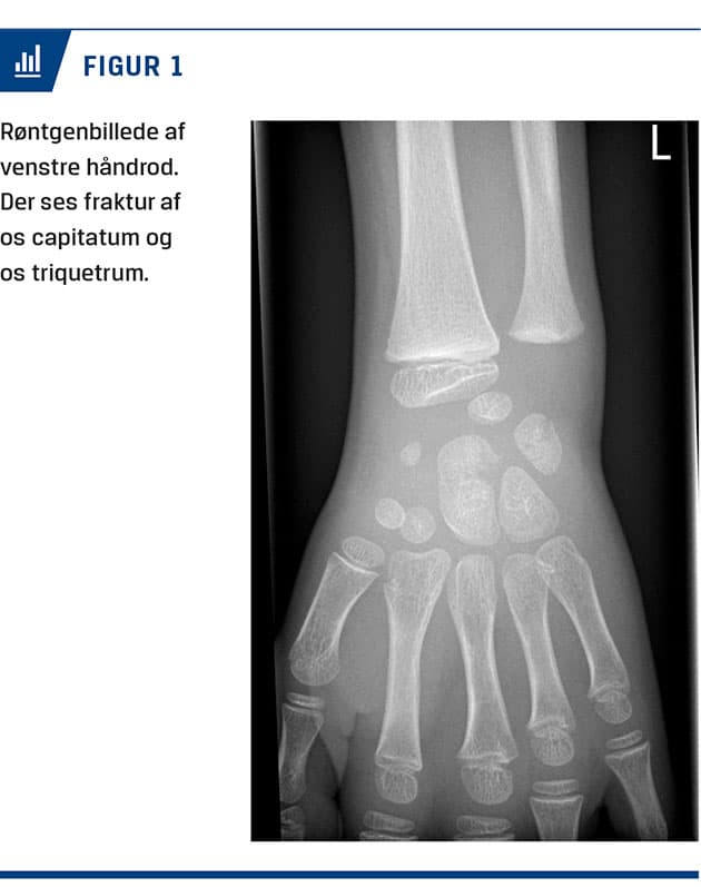 En syvårig dreng blev behandlet på skadestuen efter at have fået klemt venstre hånd mellem kanten af et skolebord og gulvet. Ved en objektiv undersøgelse fandt man misfarvning både dorsalt og volart over håndroden. Han var tydeligt smertepåvirket ved både direkte og indirekte undersøgelse af håndroden. Bevægeligheden i hånden var ophørt pga. smerter. En røntgenoptagelse viste fraktur af os capitatum og os triquetrum (Figur 1). Samme dag blev der foretaget CT af venstre hånd for verificering af diagnosen samt udelukkelse af øvrige frakturer og dislocering med betydning for behandlingen (Figur 2). Frakturerne i os capitatum og os triquetrum var udislocerede og egnede til konservativ behandling. Der blev anlagt en dorsal gipsskinne. Ved ambulant kontrol syv dage posttraumatisk var der bedring smertemæssigt. En røntgenoptagelse viste uændret stilling af frakturerne. Ved ambulant kontrol fire uger efter traumet viste en røntgenoptagelse begyndende kalcifikation af frakturen, klinisk var der smertefrihed. Patienten blev henvist til ergoterapi. Efter seks måneder havde han normal bevægelighed og god kraft i