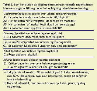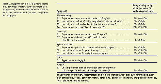 Materiale og metoder: Der indgik 11 kliniske speciallæger fra et bredt udsnit af sygehusafdelinger. De gennemførte først identifikation og registrering af underernæring, overvægt, fysisk inaktivitet, rygning og skadeligt alkoholforbrug ud fra journaloplysninger på egen afdeling (i alt 2.420 gange). Dernæst evaluerede specialisterne forståelighed, anvendelighed og dækning (363 gange).