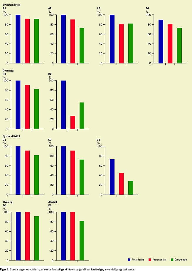 Evalueringen viste, at ni af de 11 kliniske spørgsmål umiddelbart var forståelige, anvendelige og dækkende. B2-spørgsmålet om taljemål og C3-spørgsmålet om øvrigt træningsprogram var forståelige, men vurderedes ikke som værende anvendelige eller dækkende (Figur 2 ).