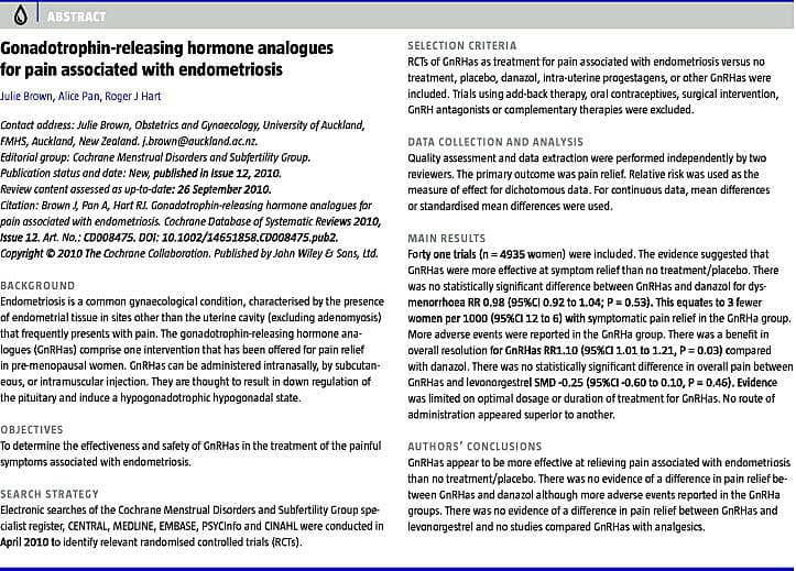 Brown et al [1] har i 2010 udarbejdet et Cochranereview, der omhandler anvendelse af GnRHa til patienter med endometriose. I randomiserede kliniske studier (RCT) bliver patienter, som har laparoskopiverificeret endometriose og får behandling med GnRHa, sammenlignet med patienter, der enten ikke får nogen behandling, får placebo, gestagenspiral eller danazol, som er et syntetisk modificeret testosteron. Administrationsform og dosis af GnRHa analyseres også. Behandlingseffekten vurderes ud fra påvirkning af patienternes smertesymptomer. Den systematiske oversigt er baseret på metaanalyse af 41 studier, hvori der var inkluderet 4.742 patienter.