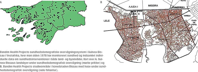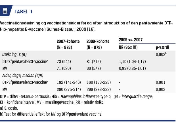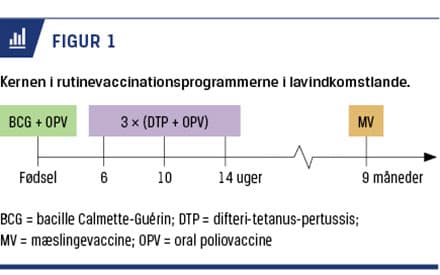 WHO’s vaccinationsprogram, Expanded Programme on Immunizations (EPI), har siden 1970’erne forhindret millioner af dødsfald pga. mæslinger, difteri og pertussis. I det anbefalede vaccinationsprogram i lavindkomstlande er kernen bacille Calmette-Guérin (BCG)-vaccine og oral poliovaccine (OPV) ved fødslen, tre doser difteri-tetanus-pertussis (DTP)-vaccine og OPV tidligt i spædbarnsalderen samt en mæslingevaccine (MV) ved ni måneder (Figur 1). Men selvom programmet forhindrer både epidemier og dødsfald, er den reelle effekt ukendt. Viden om, hvilken effekt programmet har på det generelle sundheds- og dødelighedsniveau (den reelle effekt), er begrænset. Bandim Health Projects demografiske overvågning af en stor del af Guinea-Bissaus befolkning gennem de seneste 40 år har gjort det muligt at dokumentere, at de reelle effekter af vacciner og andre præventive sundhedsinterventioner ofte er meget anderledes end forventet. Det har derfor også været muligt at levere data, som kan bruges til at optimere vaccinationsprogrammet. Der er traditionelt blevet sat lighedstegn mellem vacciners forebyggende effekt på det specifikke patogen og deres effekt på den generelle sundhed. Således har man i WHO antaget, at vaccinernes samlede effekt kunne forudsiges på baggrund af den specifikke effekt og den estimerede sygdomsbyrde [1]; hvis for eksempel mæslingeinfektion forårsager 15% af dødsfaldene blandt børn, vaccinen er 90% effektiv, og vaccinationsdækningen er 85%, vil den forventede reduktion i dødeligheden ved at indføre en MV være 11% (0,90 × 0,85 × 0,15 = 0,11).
