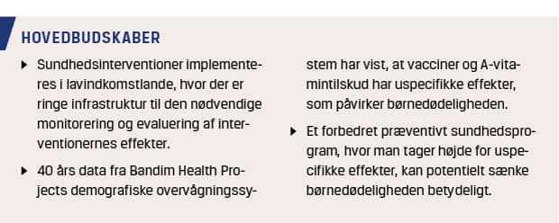 I en reanalyse af et af de studier, som dannede baggrund for politikken om at give generelt A-vitamintil-skud, var hele den gavnlige effekt blandt ikkevaccinerede børn, mens der sås stærke negative effekter af A-vitamintilskud hos piger, som fik DTP-vaccine under opfølgningen [25]. Interaktioner mellem højdosis-A-vitamin og rutinevacciner kan således forklare, at der ikke lader til at være samme gavnlige effekt af A-vitamintil-skud i dag, som sås, da politikken blev formuleret [26]. Ved en kontinuerlig monitorering af interventioners effekt på børnesundheden kan man således identificere interaktioner mellem interventioner og derigennem være i stand til at optimere programmerne.