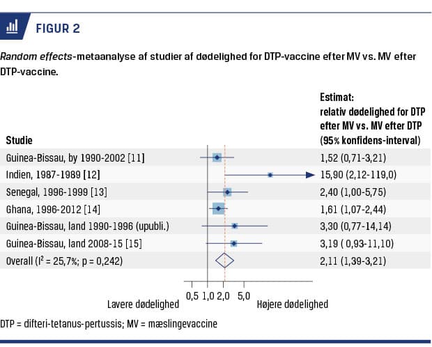 Eftersom den sidst givne vaccine har den stærkeste uspecifikke effekt på barnets immunsystem, kan en ændring af vaccinesekvensen med en ikkelevende vaccine som den seneste imidlertid have den modsatte effekt. Adskillige studier tyder på, at DTP-indeholdende vacciner, der gives efter MV, øger dødeligheden. I metaanalysen af de tre studier, som indgik i WHO’s review [11-13], var dødeligheden 2,66 (95% konfidens-interval (KI): 1,04-6,81) gange højere for børn, der var vaccineret med DTP efter MV, end for børn, der var vaccineret med MV efter DTP [2]. De senere tilkomne studier [14, 15] viser samme billede: Dødeligheden er fortsat 2,11 (95% KI: 1,39-3,21) gange højere for børn, som har fået DTP som den seneste vaccine efter MV (Figur 2).