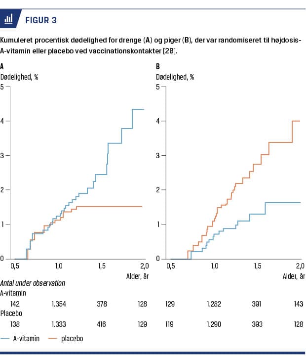 Mens nogle interventioner, herunder vacciner, anbefales uden studier af effekten på den generelle dødelighed, blev effekten af højdosis-A-vitamin på dødelighed undersøgt i 1980-1990’erne. I en metaanalyse af otte randomiserede forsøg af A-vitamin versus placebo i 1993, fandt man en 23% reduktion i den generelle børnedødelighed ved tilskud af A-vitamin [20], og WHO anbefalede derfor at give A-vitamin hver 4.-6. måned i områder med høj dødelighed. Mekanismen bag effekten var dårligt forstået, og den gavnlige effekt, som sås i seks ud af otte studier, kunne ikke forklares med børnenes A-vitaminstatus [20, 21].