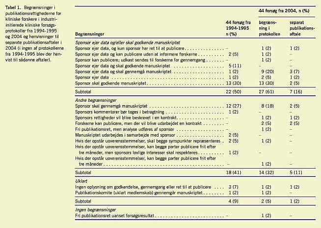Eftersom nogle af forsøgene fra 2004 måske aldrig bliver publiceret, må man have et vist forbehold over for en direkte sammenligning af protokollerne fra 1994-1995 med protokollerne fra 2004. Vi fandt imidlertid lignende begrænsninger i publikationsretten i protokoller fra begge tidsperioder (Tabel 1). Ud af de 44 protokoller fra 2004, henviste man i 13 (30%) til en separat publikationsaftale mellem sponsoren og forskerne, i modsætning til protokollerne fra 1994-1995, hvori der ikke i et eneste tilfælde blev henvist til sådanne aftaler. Ingen af disse aftaler var blevet indsendt til de videnskabsetiske komitéer, og der var derfor ikke adgang til dem.