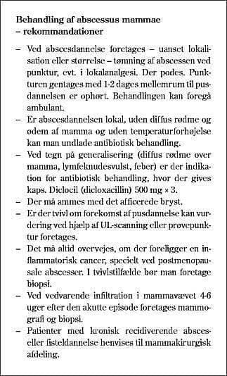 Diskussion: Punkturbehandling er patientvenlig og ikke ressourcekrævende; amning kan fortsætte uhindret. Generel anæstesi er sjældent nødvendig; patienterne kan behandles ambulant. Der er kun i særlige tilfælde behov for UL-vejledt punktur og drænagebehandling. Recidivhyppigheden efter incision eller punktur var identisk. Der opstilles rekommandationer for behandlingen, der kan udføres på den modtagende afdeling. Patienter med kroniske, recidiverende absces- og fisteldannelser bør henvises til en afdeling, der er specialiseret i mammakirurgi.