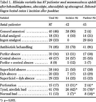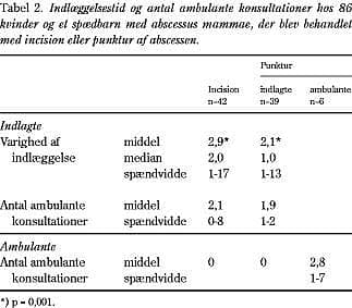 Resultater: I alt 87 kvinder med abscessus mammae blev behandlet med incision (42 kvinder, 48%) eller punktur (45 kvinder, 52%). Middelindlæggelsestid efter incision var 2,9 dage (median to dage) og efter punkturbehandling 2,1 dage (median en dag); p = 0,001. Der blev udført incision i generel anæstesi hos 38 patienter (90%). Der blev udført punktur hos 43 af 45 kvinder uden analgesi eller i lokalanalgesi. Recidiv sås hos otte kvinder (19%) efter incision og hos ni kvinder (20%) efter punkturbehandling.