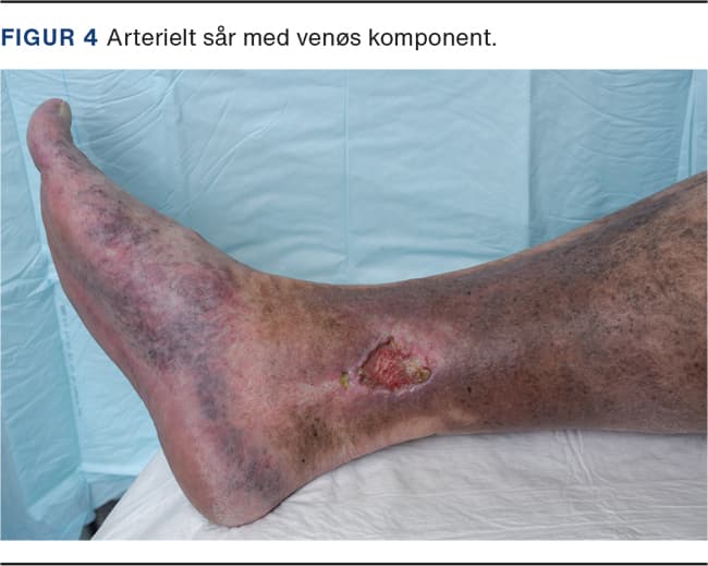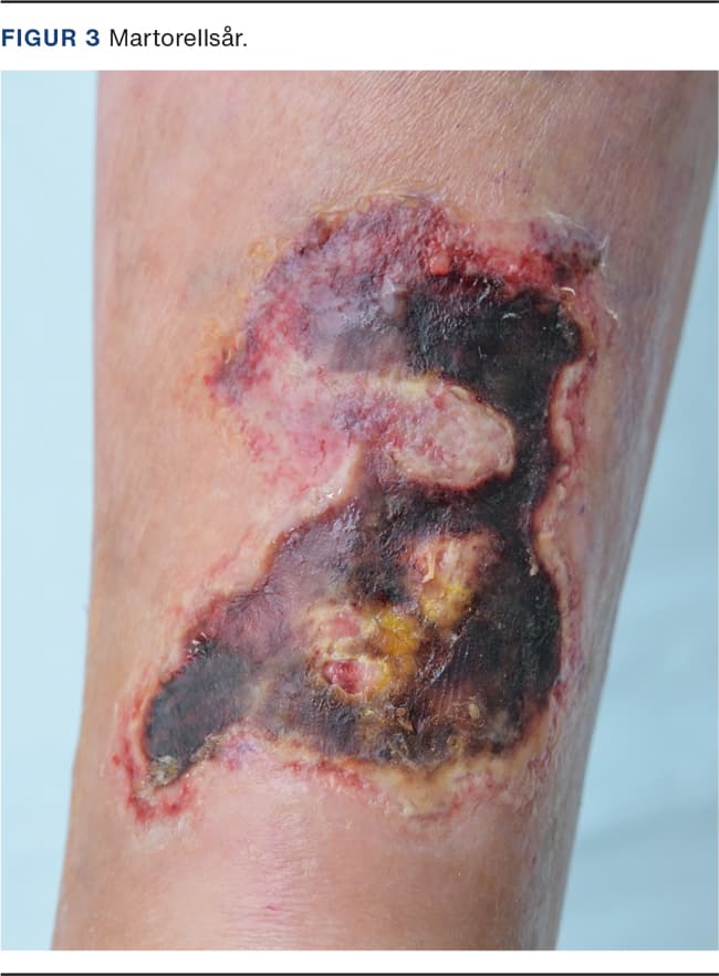 Der er formentlig tale om en disposition til sårdannelse, idet god kontrol af hypertension ikke udelukker sårdannelse. Sårene er ofte meget smertefulde, og behandlingen læner sig op ad den, der anvendes ved kalcifylaksi. Det er en vigtig differentialdiagnose til sår baseret på perifer iskæmi, idet behandling af Martorellsår består i oprensning til fascieniveau og delhudstransplantation. Der er beskrevet tilfælde, hvor punch graft-behandling har haft eklatant effekt på såvel sårheling som smerter [26, 27]. Diagnosen må betragtes som en udelukkelsesdiagnose, og i den oprindelige beskrivelse indgik der syv kliniske kriterier [28], som skal opfyldes for at stille diagnosen: 1) placering anterolateralt på en underekstremitet, 2) arteriel diastolisk hypertension i underekstremiteterne, 3) kraftig pulsation i underekstremiteternes arterier, 4) fravær af arterielle kalcifikationer, 5) fravær af kronisk venøs insufficiens, 6) symmetriske læsioner eller hyperpigmentering og 7) øget smerte i horisontal position. Desuden bør det nævnes, at lidelsen hyppigst forekommer hos kvinder. Et eksempel på sårtypen ses på Figur 3.