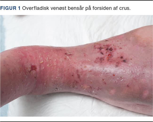 Venøse bensår er den hyppigste form for kronisk bensår, og prævalensen er 0,15-0,3% [3]. Tilstanden er associeret med betydelig morbiditet og øget risiko for komplikationer, herunder infektion, samt nedsat livskvalitet [4]. De venøse bensår forårsages af venøs insufficiens, som kan skyldes både klapinsufficiens (70-80%) og obstruktion (20-30%) eller en kombination af disse [5]. Dette kan medføre venøs hypertension og ødem i underekstremiteterne samt sårdannelse [6]. Andre medvirkende faktorer er immobilitet og overvægt [6]. Prædilektionsstedet for de venøse bensår er primært medialsiden af den distale tredjedel af crus og ved den laterale malleol [5]. Sårene er karakteriseret ved en enkelt eller multiple læsioner; de er overfladiske med uregelmæssig form og ofte væskende (Figur 1) [5]. Der kan desuden ses lipodermatosklerose (fortykkelse af huden og det underliggende væv), hæmosiderinaflejringer (hyperpigmentering af huden i gamacheområdet distalt på crus) samt stasedermatitis (rødme, skældannelse og evt. vesikler) af den omkringliggende hud [3].