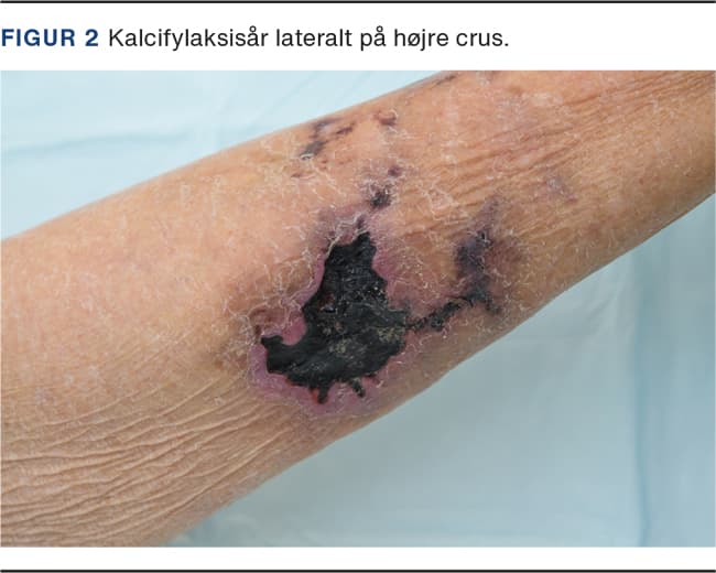 Kalcifylaksi er en progressiv inflammatorisk lidelse, som er lokaliseret til små- og mediumstore arterier og medfører trombotisk betinget iskæmi med en række dermatologiske manifestationer fra små noduli til større nekrotiske sår (Figur 2) [22]. Sårene opstår hyppigst hos patienter, som er i hæmo- eller peritonealdialyse, men ses også hos personer, som har diabetes og adipositas [23]. Tilstanden er desuden associeret til brugen af vitamin K-antagonister (e.g. phenprocoumon). Lokalisationen er meget varierende, men hyppigst forekommer sårdannelsen på truncus og ekstremiteter [24]. Sårene medfører ofte vanskeligt behandlelige smerter. Der knytter sig en høj mortalitet til tilstanden, idet ca. halvdelen af patienterne er døde inden for det første år efter diagnosticering. En række differentialdiagnostiske forhold skal iagttages [23].