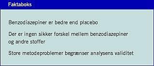 Hos alkoholafhængige personer kan der ved pludseligt ophør eller reduktion i alkoholindtaget udvikles en abstinensreaktion med varierende grader af fysiske symptomer i form af tremor, svedtendens, puls- og blodtryksstigning, indre uro, motorisk uro, søvnforstyrrelser, kvalme, opkastning og temperaturstigning. I svære tilfælde kan der forekomme abstinenskramper og delirium tremens. Sidstnævnte, som er karakteriseret ved hallucinationer, vrangforestillinger, desorientering og bevidsthedsplumring er en livsfarlig psykotisk tilstand, der ubehandlet har en mortalitet på 15% [1]. Der er således god grund til systematisk at undersøge evidensen for forskellige farmakas effekt og bivirkninger ved fysiske, konvulsive og delirøse abstinenssymptomer. I en tidligere metaanalyse blev benzodiazepiner fundet at være effektive til behandling af alkoholabstinenssymptomer, samtidig med at denne stofgruppe havde en større sikkerhedsmargen og lavere misbrugspotentiale end andre præparater taget under et [2]. I den aktuelle Cochrane-analyse tages der udgangspunkt i denne konklusion, og den er udført med henblik på at opdatere vores empiriske viden om at benytte benzodiazepiner i alkoholabstinensbehandlingen.