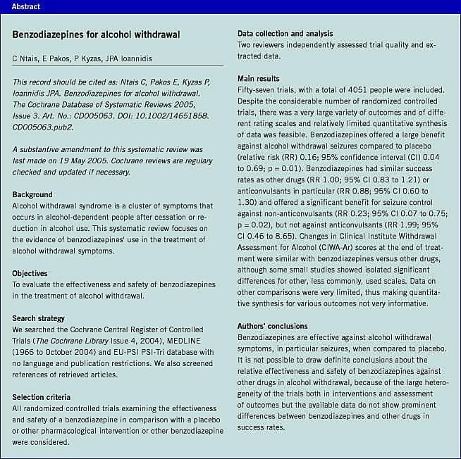 Cochrane-analysen, som her er angivet i en forkortet udgave, bygger på randomiserede og kontrollerede studier, hvori effekten på alkoholabstinenssymptomer af et eller flere benzodiazepiner blev undersøgt. Der blev fundet 57 studier, der opfyldte disse kriterier, med i alt 4.051 forsøgspersoner. I forhold til placebo var benzodiazepiner signifikant bedre til forebyggelse af abstinenskramper. Behandling med benzodiazepiner var også mere effektivt ved fysiske abstinenssymptomer, men forskellen blev ikke fundet statistisk signifikant. Sammenligning mellem effekten af benzodiazepiner og andre farmaka taget under et viste ingen signifikante forskelle på fysiske abstinenssymptomer, delirium tremens eller på evnen til at forebygge abstinenskramper. Underinddeling af gruppen af andre stoffer i antikonvulsiva (barbiturater, carbamazepin og valproat) og nonantikonvulsiva viste, at både ved fysiske abstinenssymptomer, abstinenskramper og delirium tremens var de antikonvulsive præparater bedre end benzodiazepiner, som igen var bedre end resten af gruppen af andre stoffer, men de nævnte forskelle blev ikke fundet statistisk signifikante.
