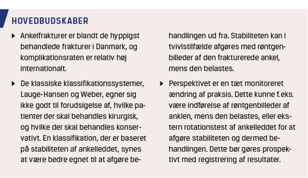 På trods af at ankelfrakturer er blandt de hyppigste frakturer, der behandles med operation i Danmark, er der fortsat mange ubesvarede spørgsmål vedrørende den optimale behandling. Nyere trends såsom klassifikation ud fra stabilitet, dynamisk fiksering af syndesmosen og direkte fiksering af den posteriore malleol kan være med til at optimere behandlingen af ankelfrakturer, men der mangler god evidens på disse nye områder.