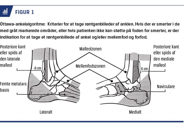 Typisk ses der hævelse af anklen og evt. hæmatom. Ved palpation af anklen og forfoden følges Ottawa-ankelalgoritme [5] (Figur 1).