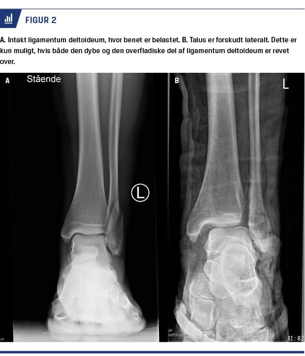 optaget, mens patienten belaster foden, er en let og pålidelig måde at afgøre stabiliteten af ankelleddet på [23]. Røntgenoptagelserne skal tages uden bandage