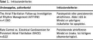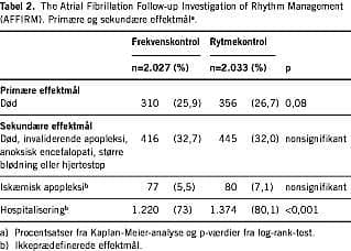 AFFIRM er den største randomiserede undersøgelse, hvor man har sammenlignet rytme- og frekvenskontrol. I alt deltog 4.060 patienter med paroksystisk eller persisterende AF. Det primære endepunkt var død. Deltagerne skulle være ældre end 65 år eller have mindst en risikofaktor for apopleksi (tid-ligere apopleksi, hypertension, diabetes, venstre ventrikel-dysfunktion) for at kunne indgå i undersøgelsen (Tabel 1 ). I frekvenskontrolgruppen anvendtes betablokkere, kalcium- antagonister og/eller digoxin til frekvensreduktion. I rytmekontrolgruppen kunne den behandlende læge vælge mellem en række antiarytmika. Amiodaron og sotalol var langt de hyppigst anvendte antiarytmika. Protokollen krævede uafbrudt AK-behandling i frekvenskontrolgruppen, men i rytmekontrolgruppen kunne denne seponeres, såfremt patienterne havde haft stabil sinusrytme i mindst en måned. Den gennemsnitlige opfølgningstid var tre et halvt år (maks. seks år). Efter fem års opfølgning havde 24,6% af patienterne i frekvenskontrolgruppen sinusrytme mod 62,6% i rytmekontrolgruppen. I frekvenskontrolgruppen var over 85% af patienterne i AK-behandling studiet igennem. I rytmekontrolgruppen faldt andelen af patienter i AK-behandling til omkring 70% ved afslutning af undersøgelsen. Der fandtes en klar tendens til en højere mortalitet i rytmekontrolarmen, mens der ikke var forskel i forekomsten af det kombinerede endepunkt af død, iskæmisk apopleksi, intrakraniale blødninger, anoksisk encefalopati, større ekstrakraniale blødninger og hjertestop (Tabel 2 ). Iskæmisk apopleksi optrådte med lige stor hyppighed i begge grupper. Af 157 apopleksier forekom 69 (44%) efter seponering af AK-behandling og 44 (28%) havde en international normalised ratio (INR) < 2 på tidspunktet for apopleksiens debut. Der var flest hospitaliseringer i rytmekontrolgruppen, men ingen forskel i rapporteret livskvalitet.