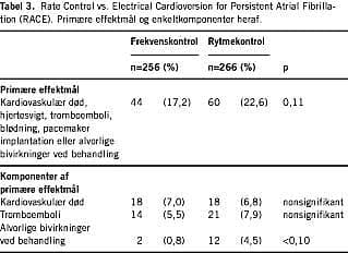 RACE-undersøgelsen adskilte sig fra AFFIRM ved udelukkende at inkludere patienter med persisterende AF (Tabel 1). Deltagerne skulle have fået mindst en og maksimalt to elkonverteringer inden for de seneste to år før randomisering. Til frekvenskontrol anvendtes digoxin, betablokkere eller kal- ciumantagonister. For patienter i rytmekontrolgruppen udførtes elkonvertering. Hvis sinusrytmen blev genetableret, blev der påbegyndt recidivprofylaktisk behandling med sotalol. Ved recidiv af AF inden for seks måneder blev der foretaget fornyet elkonvertering, og sotalol blev erstattet af flekainid eller propafenon. I tilfælde af fornyet recidiv gentoges elkonvertering efter opstart af amiodaronbehandling. I frekvenskontrolgruppen fortsatte AK-behandling studiet igennem, mens denne kunne seponeres fire uger efter etablering af stabil sinusrytme i rytmekontrolgruppen. Langt størstedelen af patienterne i begge grupper var i AK-behandling igennem hele opfølgningstiden. Det primære endepunkt var en kombination af kardiovaskulær død, hjertesvigt, tromboemboliske komplikationer, større blødning, behov for pacemaker og alvorlige bivirkninger til antiarytmisk behandling. Den gennemsnitlige opfølgningstid var 2,3 år. I frekvenskontrolgruppen havde 10% sinusrytme efter endt opfølgning sammenlignet med 39% i rytmekontrolgruppen. Halvdelen af patienterne med sinusrytme i frekvenskontrolgruppen (13/26) havde fået foretaget elkonvertering pga. intolerable symptomer. Der var en klar tendens til en lavere forekomst af det primære endepunkt i frekvenskontrolgruppen end i rytmekontrolgruppen (Tabel 3 ). Der var ikke forskel i raten af kardiovaskulær død eller i hyppigheden af tromboemboliske komplikationer, om end der var en tendens til flere tromboembolier i rytmekontrolgruppen. Næsten en tredjedel af de tromboemboliske komplikationer i rytmekontrolgruppen (seks ud af 21) optrådte efter seponering af AK-behandling, og fem af disse optrådte under sinusrytme.