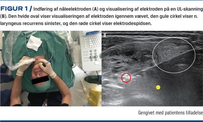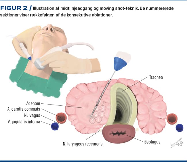 RFA inducerer via en nåleelektrode med radiobølger en termisk ablation af vævet. Varmeudviklingen medfører en koagulationsnekrose af det omkringliggende væv [15]. Teknikken benyttes også til bl.a. behandling af hjerterytmeforstyrrelser og levertumorer. Proceduren udføres ambulant i lokalbedøvelse. Patienten positioneres i rygleje med moderat ekstension af nakken (Figur 1). Herved kan operatøren vurdere knudens beliggenhed og den bedste adgang. Før proceduren injiceres der lokalanæstesi subkutant og omkring thyroideakapslen. Om nødvendigt gives der præoperativt smertestillende og beroligende medicin (f.eks. midazolam). Ved procedurens begyndelse indføres nåleelektroden UL-vejledt i knuden via et perkutant indstik (Figur 2). Indstikket foretages fra midtlinjen for at undgå kritiske strukturer og for at opnå, at hele elektroden kan ses på UL-skanningen. Knuden opdeles i mindre sektioner, som behandles konsekutivt (Figur 2). Denne fremgangsmåde minimerer risikoen for, at elektroden og derved varmeudviklingen påvirker den trakeo-øsofageale overgang med potentielle skader på n. laryngeus recurrens, trachea og øsofagus. Patienten observeres for udvikling af halssmerter, stemmeændring og hæmatomdannelse i 1-2 timer efter proceduren. Herefter hjemsendes patienten uden yderligere restriktioner.