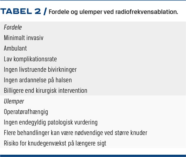 RFA er en effektiv og sikker behandling af benigne thyroideaknuder. Den primære patientgruppe for RFA er patienter med kolde, solide, benigne og symptomgivende thyroideaknuder 2 cm og under 20 ml. Kirurgi og radiojod er fortsat førstelinjebehandling ved knuder i thyroidea, men RFA har nogle oplagte fordele og kan supplere disse behandlinger (Tabel 2) – herunder giver RFA færre komplikationer og har færre omkostninger.
