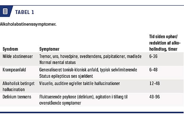 Samtidig øges følsomheden for glutamat, og antallet af NMDA-receptorer øges. Denne ligevægt (toleransudvikling) opretholdes, så længe der er alkohol til stede i kroppen; ved nedsat eller ophør med alkoholindtag opstår der neuronal hyperaktivitet, kaldet abstinenssymptomer. Disse opstår timer til dage efter nedsat/ophørt alkoholindtag og består af et spektrum fra mild autonom hyperaktivitet til delirium tremens (DT) (Tabel 1). DT ses hos 5% af patienterne med alkoholabstinenssymptomer, og mortaliteten er på op til 20%, hvis tilstanden ikke behandles. Manifest DT er vanskelig at behandle, men mortaliteten kan med behandling reduceres til under 1% [4, 5].